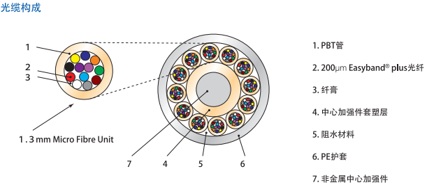 產品特點:采用200μm的B6a2光纖,構建小型化的12芯光纖微單元,在此基礎上使得光纜的尺寸得以小型化。這種光纜結構可以使144芯以下的全系列氣吹微纜均可以使用12/10以下規格的常用微管。解決了傳統層絞式大芯數氣吹微纜的直徑超過了12/10規格微管所允許的最大微纜直徑的問題,也使得其它芯數的微纜可以采用更小規格的微管進行氣吹敷設,從而提高了管道中的光纖敷設密度。